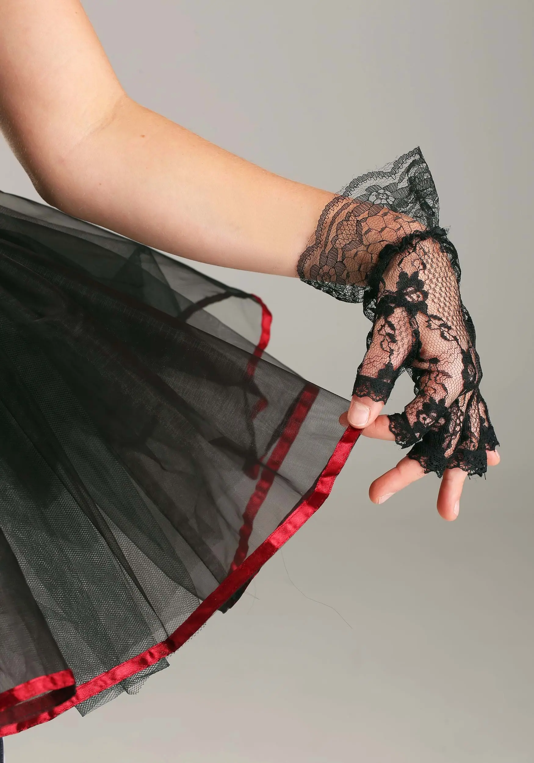 - Tutu skirt is multiple layers of tulle & organza, edged w/ blood-red ribbon
