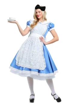 The blue dress with its full skirt has the dreamlike quality that a trip to Wonderland calls for. Whether you’re looking for an Alice costume for your tea party event or you landed the part of Alice in a play, you’ll love the pretty details with ruffled eyelet along the hem of the skirt and around the elegant pinafore. Hey, whether you end up too small or too big, at least you’ll look just as dreamy as when you started.