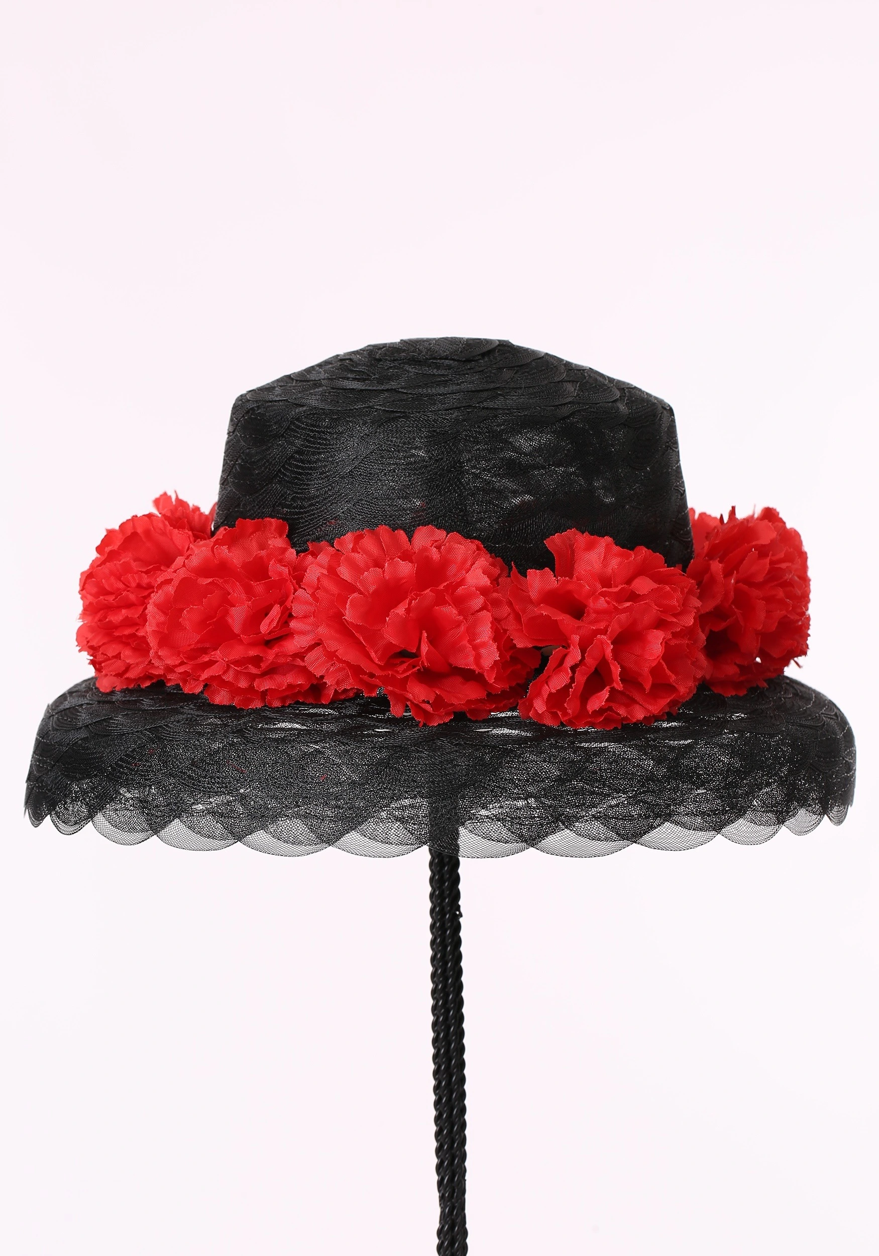 This hat would look right at home in the stands of the Kentucky Derpy. It has a layered wicker texture, a squared-off top, and a scalloped brim that is rounded in a uniquely Southern way. The bright red flowers take the black hat from dignified to party ready and will go well with lady-like gloves and your Sunday best!
