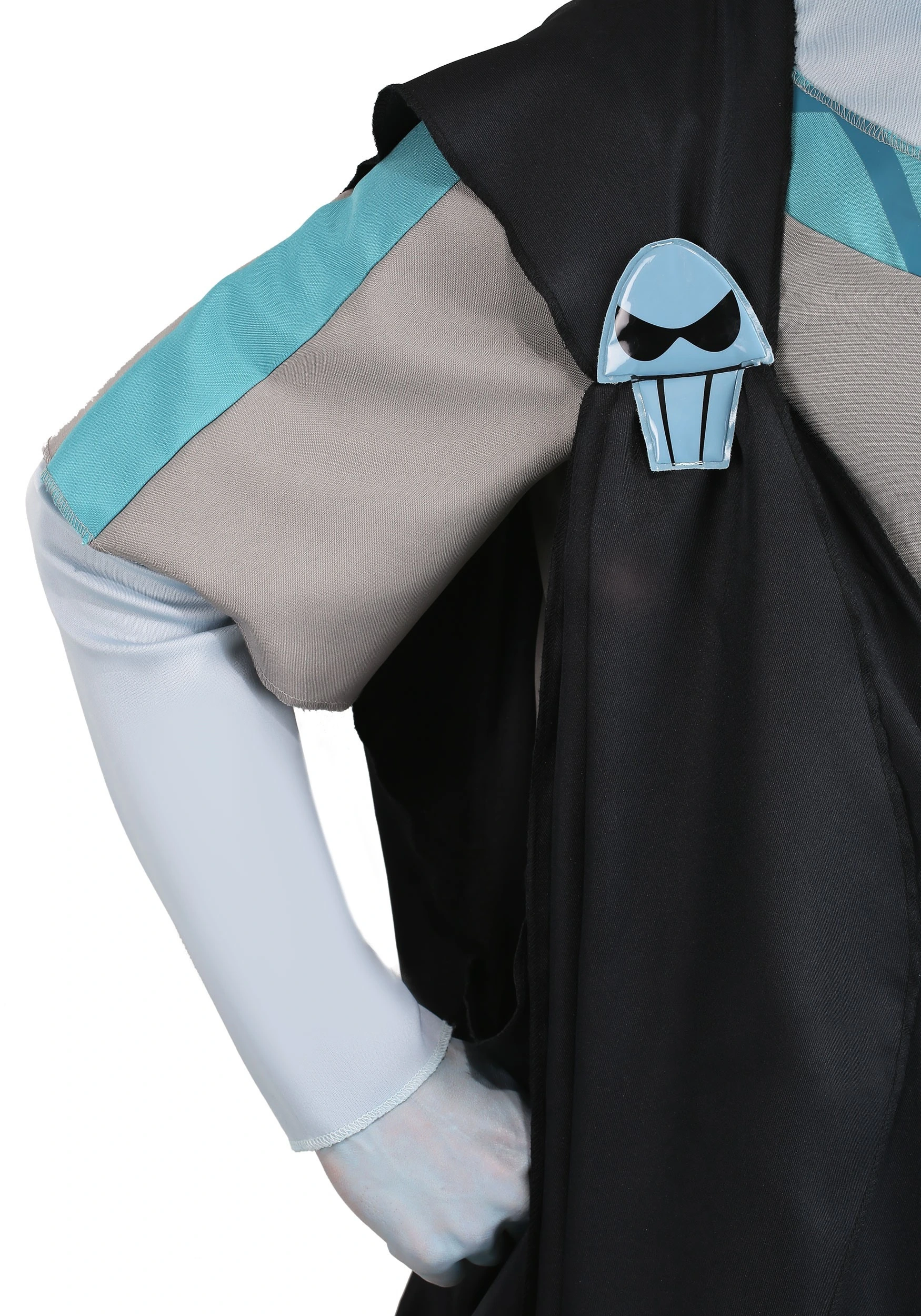 - One-shoulder robe has vinyl skull medallion at shoulder