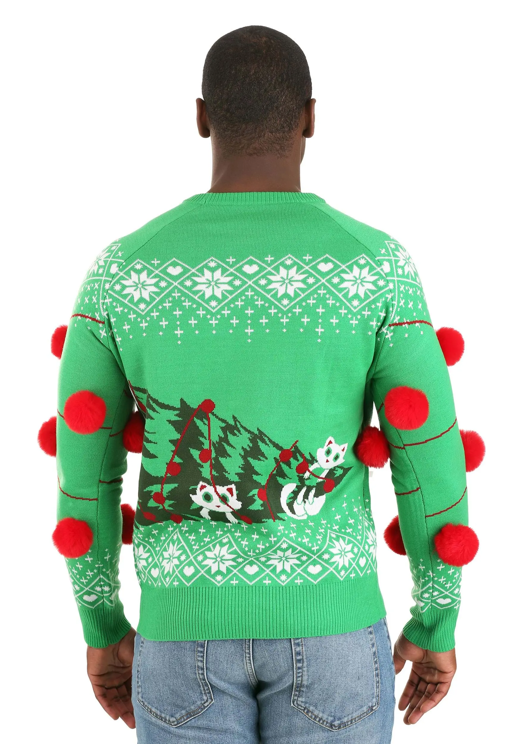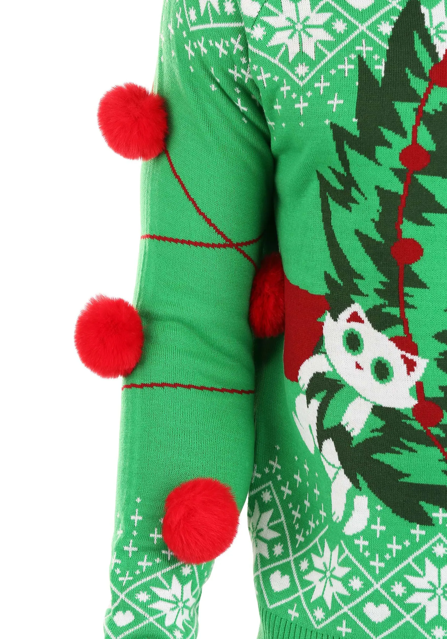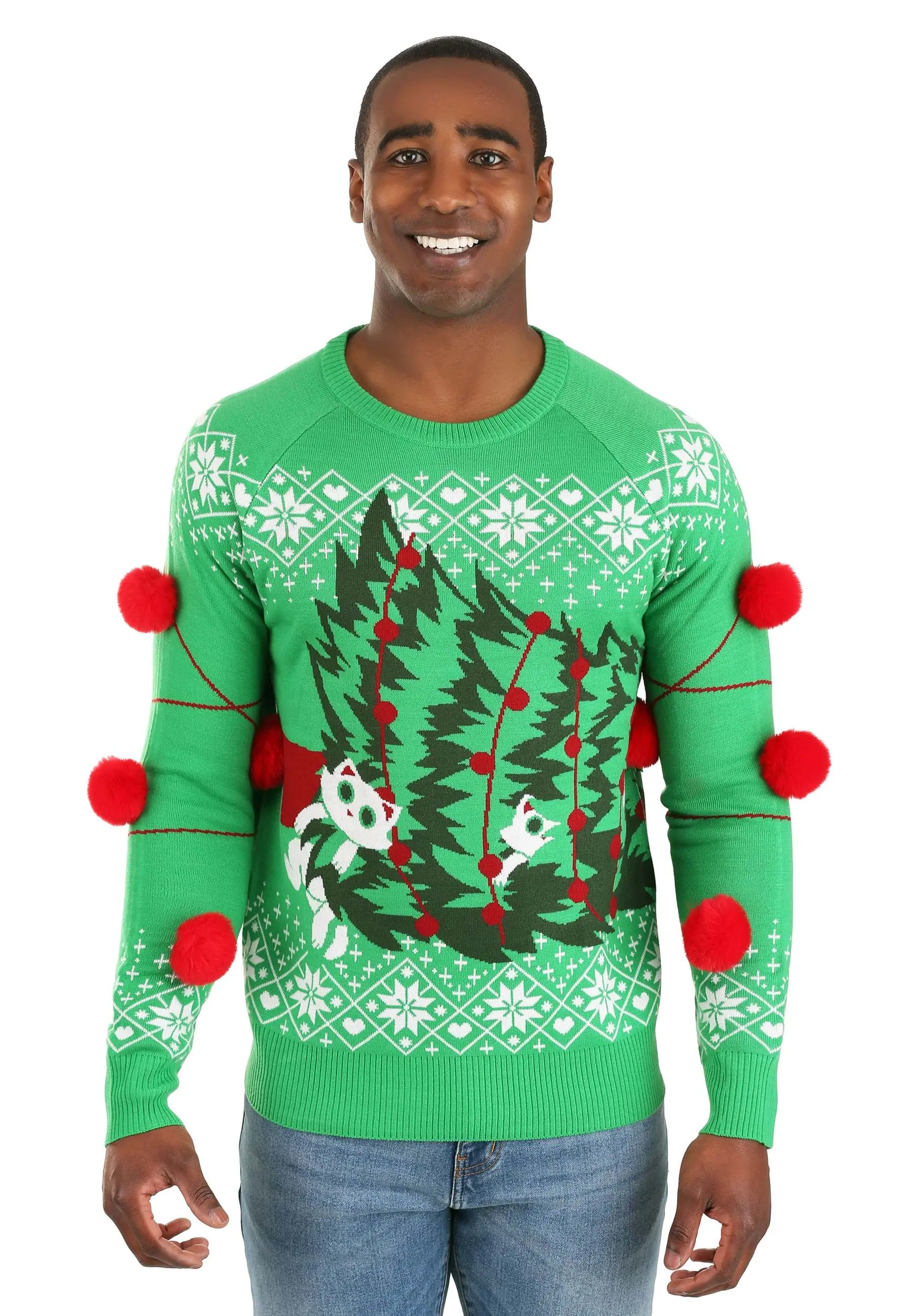 This Kitty Trouble Ugly Christmas Sweater showcases the various kitty-cat angels engaged in some devilish behavior! The adult sweater has an all-over design that has various cats sabotaging a freshly decorated Christmas tree. If you’ve ever had a cat around the holidays, then you know exactly how true this scene feels! The knit sweater is made out of acrylic materials, and also features rib-knit sleeves and waistband the help give it a warm and cozy fit. If you love cats, Christmas, or just the dual nature of your favorite feline friends, then this adorable sweater is perfect for you!