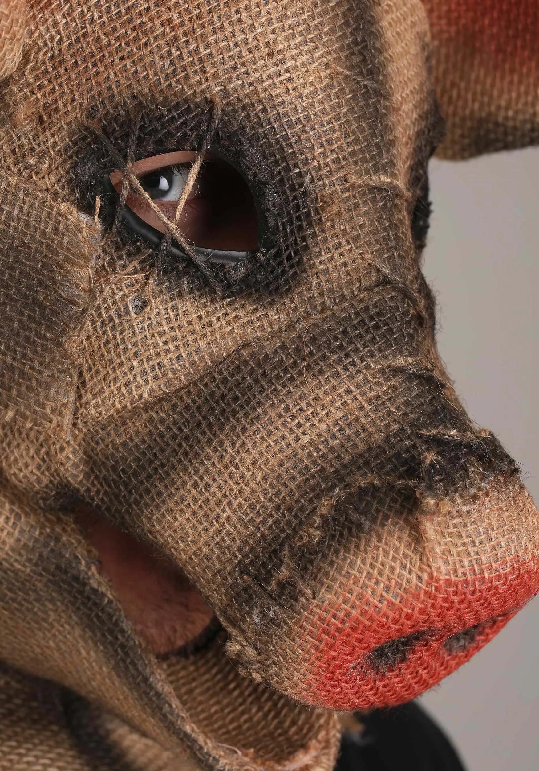 - Molded plastic mask is covered w/ burlap hood
