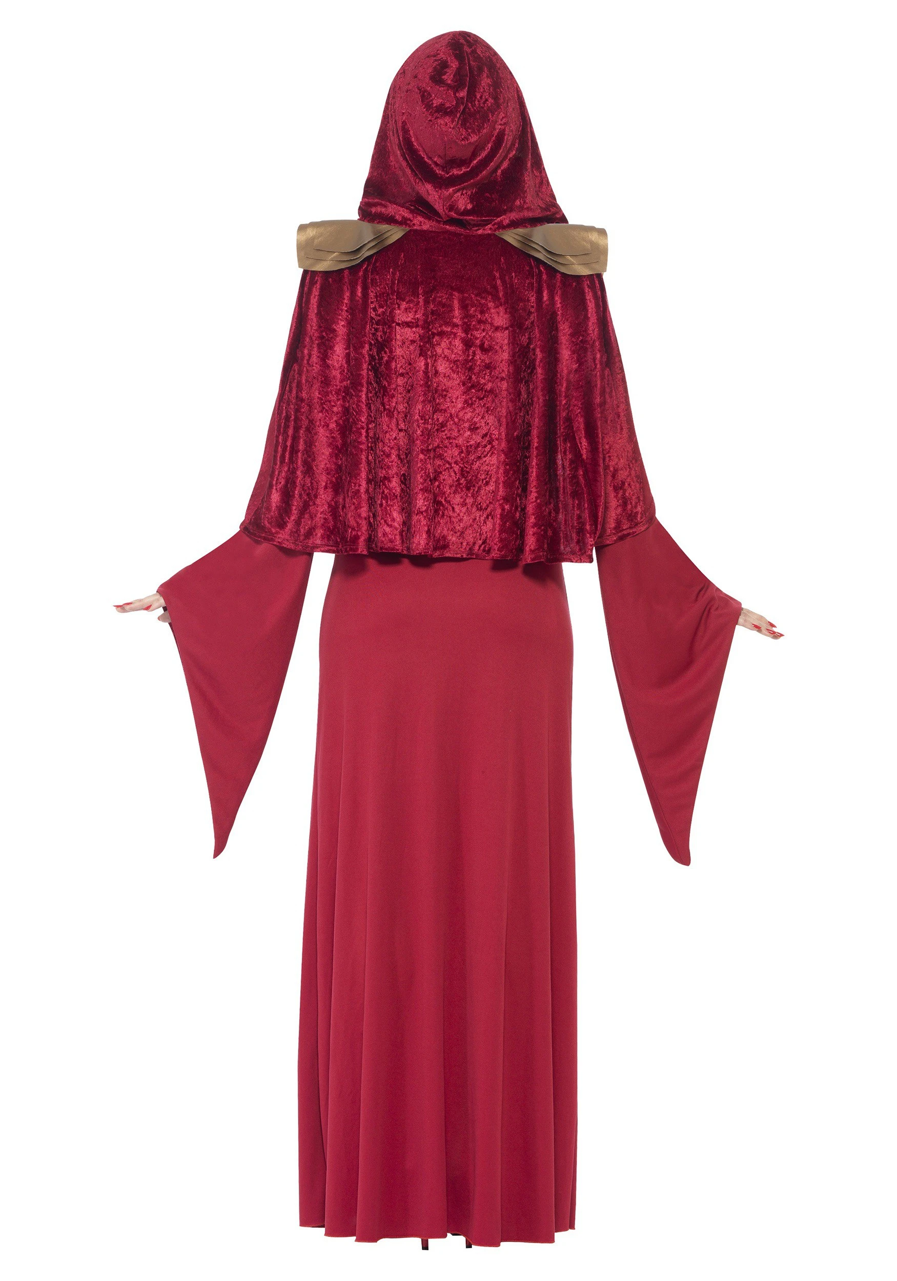 No matter what your followers choose to believe, all that is important is that they have faith in you as you have faith in your calling. For you are become like unto a lord of light when you step into this Red High Priestess costume. This lovely and powerful red v-neck pullover gown has a fitted bodice with elegantly flared, hanging sleeves, giving you the noble look that you have earned while the brocade ribbon belt bound around your waist shows a blend of humble means and divine wrath. The crushed velvet cape with faux leather flaps will keep you warm in the chill winter… as though you ever feared the cold while alongside your flame! This may be enough or perhaps you seek some skull or divine ornament accessories, or even a vivid red wig to complete your holy look.