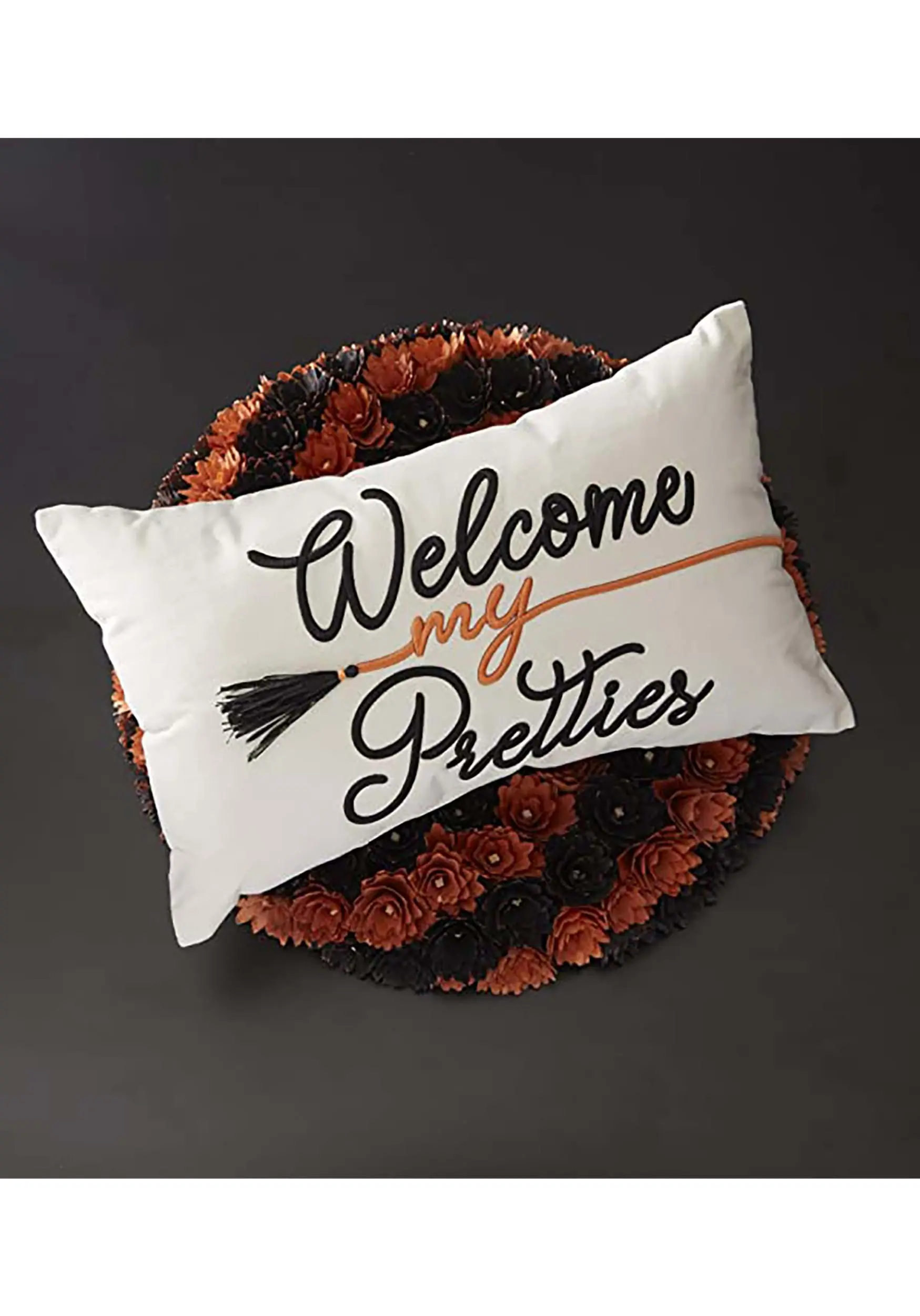 - Pillow case has “”WELCOME MY PRETTIES” embroidered on front in script font